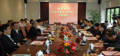 200803-24  廣州大學代表團來我校參觀交流3月20日下午,廣州大學黨委書記易佐永率該校校領導、各部門負責人一行22人,來我校參觀交流。 我校黨委書記江潭瑜、副校長阮雙琛陪同廣州大學一行,先后參觀了我校金工坊、西南學生宿舍、體育場館和科技樓實驗室。 在辦公樓201會議室,廣州大學一行與我校黨政領導、機關各部門負責人進行座談。校領導江潭瑜、章必功、陶士平、阮雙琛、陳思平等出...
