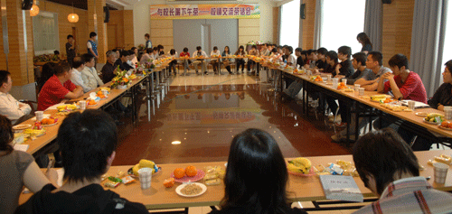 200803-20  校長與學生代表喝下午茶3月19日下午,“與校長喝下午茶――校情交流茶話會”在國際會議廳二樓咖啡廳舉行。學生代表與校領導就校園建設、校園文化、選課系統、治安綜合管理等校情進行民主平等的交流。章必功校長、邢鋒副校長、陳思平副校長,校長辦公室、宣傳部、校團委、教務處、學生處、后勤處、保衛處、招生就業辦、場館中心、學生公寓中心、輔導員辦公室、校醫院等職能部門負責人以及校院兩級學生會主席、部分學代會委員出席茶話會。茶話會由校團委主持...
