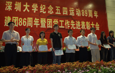 200805-12  我校舉行紀(jì)念五四運動89周年、建團86周年暨團學(xué)工作先進表彰大會5月4日,“深圳大學(xué)紀(jì)念五四運動89周年、建團86周年暨團學(xué)工作先進表彰大會”在科技樓1號報告廳隆重舉行。校黨委副書記陶一桃、副校長李永華以及學(xué)生處、團委和各學(xué)院的負責(zé)人出席了會議。大會由校團委副書記方琳主持。 大會表彰“五四紅旗團委”和“五四紅旗團支部”等33個...