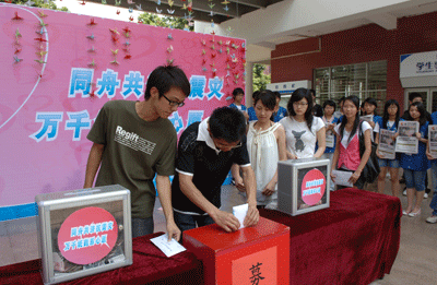 200805-15  深大學(xué)子為四川災(zāi)區(qū)獻愛心5月14日中午,在校團委的組織下,我校學(xué)生開展“同舟共濟抗震災(zāi),萬千紙鶴寄心愿”為四川災(zāi)區(qū)捐款活動。同學(xué)們不顧炎熱,排著整齊的長隊為災(zāi)區(qū)人民奉獻自己的愛心,盡自己的一份綿薄之力,彰顯了我校學(xué)子“一方有難,八方支援”的人道主義精神。 在活動現(xiàn)場,校團委副書記方琳代表校團委感謝并...