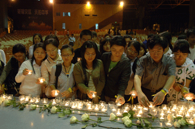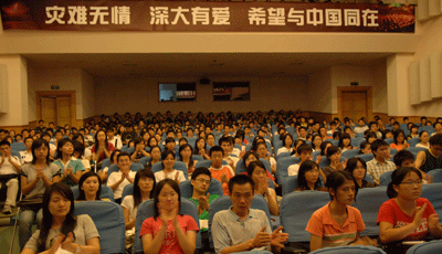 200805-21  為逝者祈禱 為生者祝福我校為汶川地震遇難同胞舉行追思會 5月20日晚,為了表達對四川汶川大地震遇難同胞的沉痛哀悼,我校在演會中心舉行追思會,為逝者祈禱,為生者祝福;并現場開展繼續向災區人民捐款活動。校領導江潭瑜、章必功、陶士平、陶一桃、阮雙琛、陳思平、李永華,各部處、各學院負責人以及各學院、留學生部學生代表近2000人參加了追思會。 ...