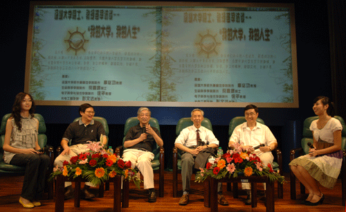 200805-27  追憶往昔 寄語青年――四位院士教授暢談“我的大學,我的人生” 5月26日晚,國際會議廳燈火燦爛,近四百名深大學子在這里聆聽校長章必功教授、生命科學學院院長倪嘉纘院士、電子科學與技術學院院長徐平教授、光電工程學院彭文達教授暢談“我的大學,我的人生”,感受名師們人生經歷,獲悉成功的心路歷程。 四位院士、教授首先追憶往昔,講述他們的人生歷程,都認為大學是神圣的地方,愿意一輩子在大學里...
