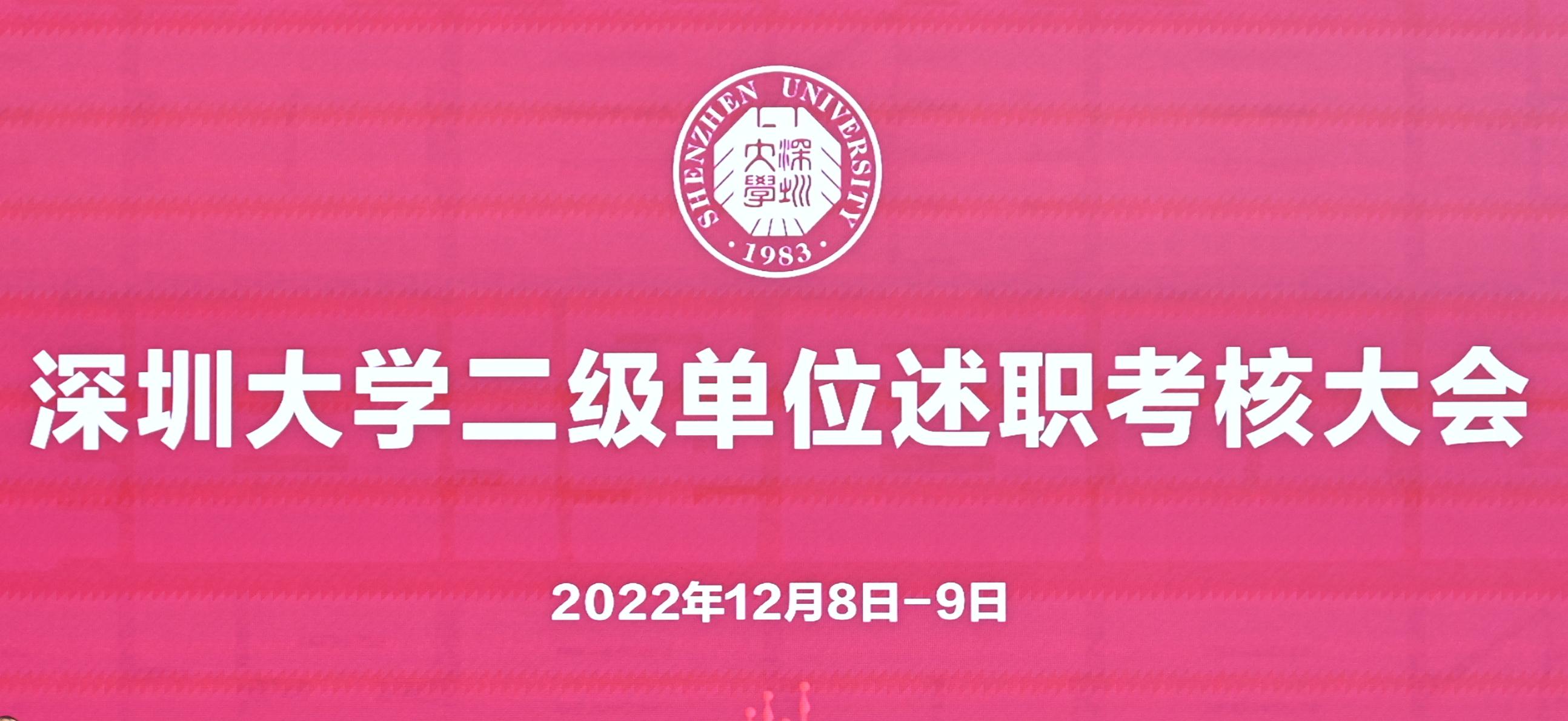 2022年12月8日-9日,深圳大學二級單位述職考核大會在粵海校區校友廣場多功能廳召開。黨委書記李清泉,校長、中國科學院院士毛軍發,中國工程院院士杜彥良,中國科學院院士彭孝軍,黨委副書記、紀委書記王月興,副校長徐晨、李永華、張學記、汪永成出席會議。學校各學院(部)院長(主任)、各職能部門主要負責人參加會議。