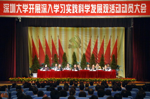 我校深入學習實踐科學發展觀活動正式啟動。3月12日上午,我校在國際會議廳召開了“深圳大學開展深入學習實踐科學發展觀活動動員大會”,省委第二批深入學習實踐科學發展觀活動指導檢查組第11組組長郭斯淦、組員林柏春,我校黨委書記江潭瑜,校長章必功,黨委副書記陶士平、陶一桃,副校長阮雙琛、邢鋒、陳思平、李永華、李鳳亮出席會議,我校副處級以上干部、各基層黨委(總支)委員、紀委委員,各黨支部書記及學生黨員代表共400余人參加了大會。動員大會由章必功主持。