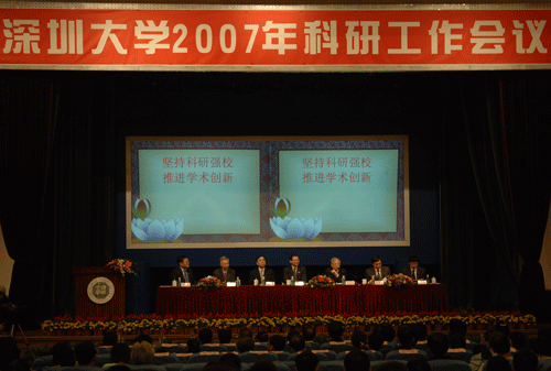 12月19日上午,深圳大學二○○七年科研工作會議在國際會議廳召開。校領導江潭瑜、章必功、陶士平、阮雙琛、陳思平,校學術委員會謝維信主任,倪嘉纘院士等參加會議。參加此次會議的還有深圳大學學術創新獎、政府獎后獎、專利發明獎獲獎人員,各學院、各部門負責人,具有正高職稱全體人員,市級以上人文社科重點研究基地正副、職領導,市級(以上)重點實驗室正、副主任,廣東省重點學科負責人,主持在研市級(以上)項目負責人以及各單位科研工作秘書。陳思平副校長主持會議。