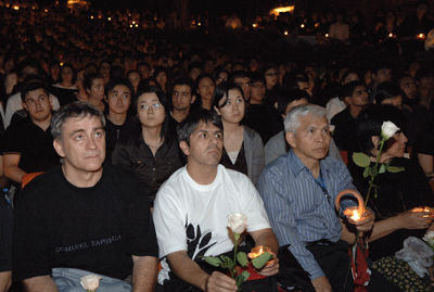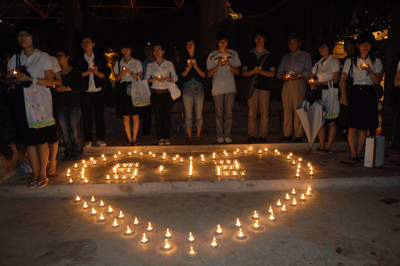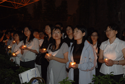 追思會現場一片肅穆,“深切哀悼四川汶川大地震遇難同胞追思會”、“祈福災區,天佑中華”等黑底白字標語懸掛在會場。追思會一開始,身著素裝的師生們起立,為遇難同胞默哀三分鐘。每位與會者點燃手中的蠟燭,點燃溫暖之光、生命之光、希望之光,為災區祈福,愿逝者安息、生者平安。現場一名同學感言,同學們積極響應學校號召,踴躍為四川災區捐款捐物,給災區人民帶去關心與支持。一名來自意大利的留學生則表示,留學生們愿與中國人民一起抗震救災,共渡難關,并祝福災區人民平安幸福。100多名四川籍學生手捧蠟燭,齊誦詩歌《生死不離》,表達他們對家鄉、家人的深情。一名四川綿陽籍的同學說,很幸運自己的家人平安無事,但家中的房子已全部倒塌。看到許多家鄉同胞失去生命,他的心情非常沉重,他相信,在全國人民的支持下,眾志成城,定能戰勝災難。另一名四川德陽籍的同學動情地說,學校老師、同學們給予他們的很大的幫助。雖然遠在千里之外求學,但學校老師、同學們給了他家的溫暖;雖然自己的家在天災中被毀,但在深大他有一個更大的家。他感謝關心支持四川災區的人們。