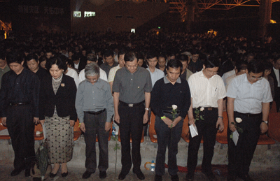 5月20日晚,為了表達對四川汶川大地震遇難同胞的沉痛哀悼,我校在演會中心舉行追思會,為逝者祈禱,為生者祝福;并現場開展繼續向災區人民捐款活動。校領導江潭瑜、章必功、陶士平、陶一桃、阮雙琛、陳思平、李永華,各部處、各學院負責人以及各學院、留學生部學生代表近2000人參加了追思會。