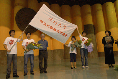 學生代表崔漢卿在儀式上發言。他說,地震發生后,深圳大學在第一時間內為我校家在四川災區的同學做了心理干預、生活補助等實際工作;全校師生踴躍為災區捐款捐物,給災區人民帶去關心與支持;很多老師和同學積極報名加入志愿者,為赴災區盡綿薄之力。作為突擊隊成員,他將發揚腳踏實地、自強不息的深大精神,不辜負全校師生的期望。