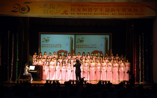 12月22日晚,國際會議廳燈火輝煌,我校校友和留學生迎新年聯歡晚會在這里精彩上演。校領導章必功、陶一桃、阮雙琛、李永華、李鳳亮,各學院校友代表,留學生部師生共四百多人出席晚會。晚會的主題是:一米陽光,百年風光。為的是凸顯全體校友無上的聚能,締造特區大學永恒的光榮。本場晚會,收到21個學院的54個班級為校友大廈捐款,共計132.6522萬元。至此,深大25周年校慶期間,共有12000多名校友返校參加校慶活動,捐款近3000萬元。