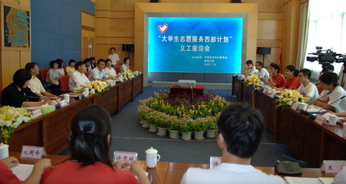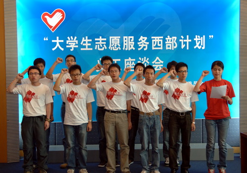 “到西部去、到基層去、到祖國最需要的地方去!”7月16日上午, “大學生志愿服務西部計劃”義工座談會在我校國際會議廳D廳舉行,我校10名志愿者莊嚴宣誓。市委常委、市教育工委書記李意珍;市政府副秘書長,市抗震救災對口支援工作領導小組前方指揮部總指揮,隴南市委常委、副市長張文;團市委書記劉燕,副書記張志華、趙嘉;市教育局副巡視員梁北漢;我校領導江潭瑜、陶一桃及我?!爸驹阜瘴鞑坑媱潯?赴地震災區首批和第二批成員出席座談會。
