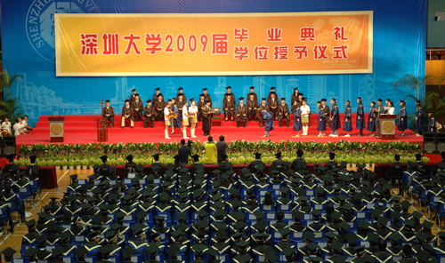 7月26日上午,深圳大學2009屆第二批本科生畢業典禮暨學位授予儀式在元平體育館舉行。深圳大學校學位評定委員會主席、校長章必功,校學位評定委員會副主席兼秘書長,副校長邢鋒,校學位評定委員會副主席、副校長李永華,校辦、教務處、學生處等部門負責人,各學院領導、主禮教授、教師代表以及觀禮家長出席儀式。邢鋒主持儀式。