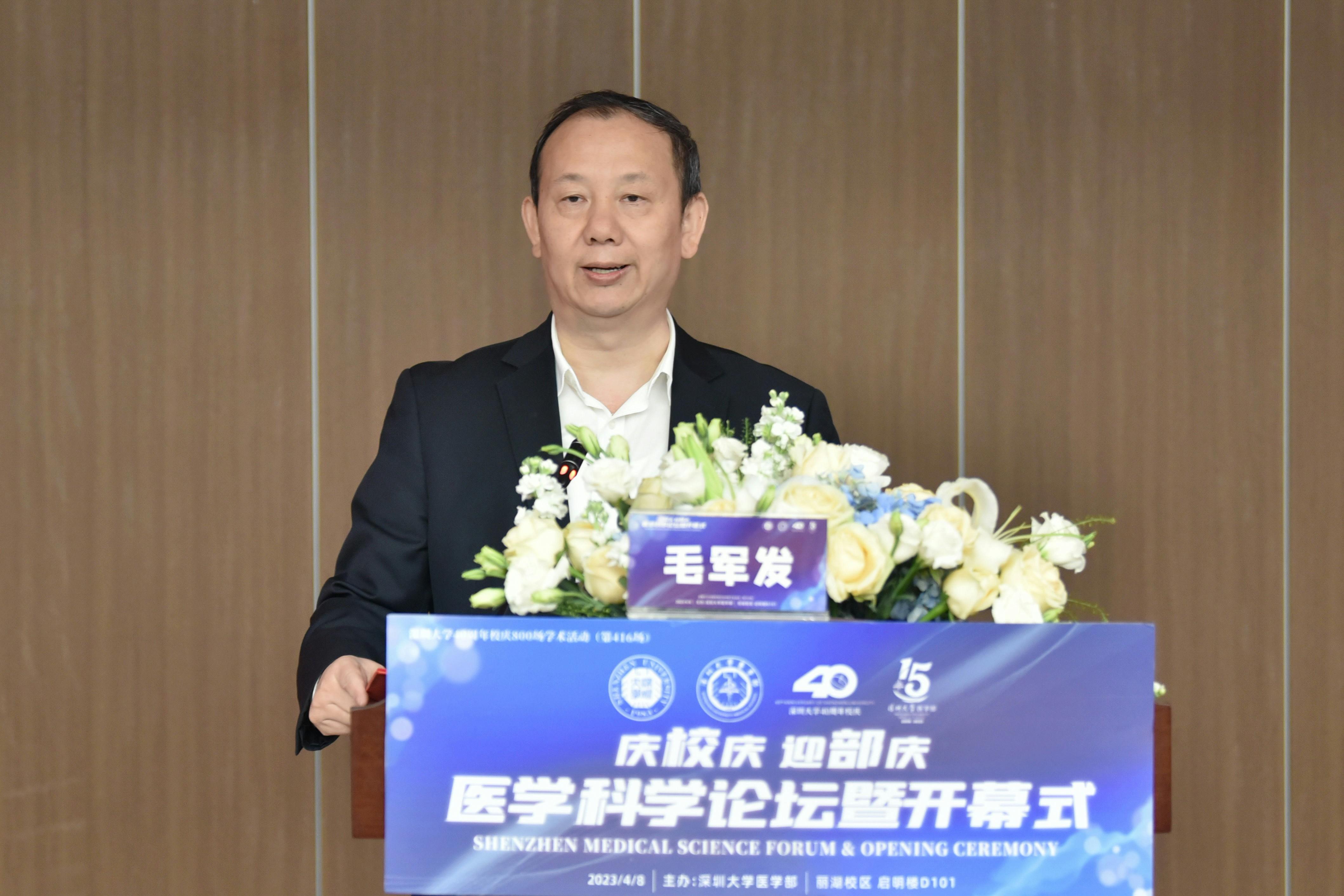 毛軍發在致辭中代表深圳大學向與會者表示歡迎并介紹了深圳大學近年來快速發展取得的辦學成就。他指出,醫學部經過15年的發展,現已成為深圳大學建設高水平大學的重要支撐力量之一。在深圳市科創委、衛健委等部門的關心支持下,深圳大學大力鼓勵科技創新和科研成果轉化,努力打造醫、教、研、產業化一體化發展平臺,搭建科學家與企業、醫療機構之間的橋梁。深圳大學將設立醫工交叉基金,為深大醫學領域前沿交叉研究提供有力支持。毛軍發呼吁與會的著名專家學者、各界醫學精英人士針對醫學研究瓶頸與熱點問題建言獻策,為醫學教育、臨床實踐提供新的思路方向,同時歡迎全國的科學家、企業家、醫療界同仁多來深圳大學溝通交流、商談合作,共同推進醫療健康產業的發展與創新。
