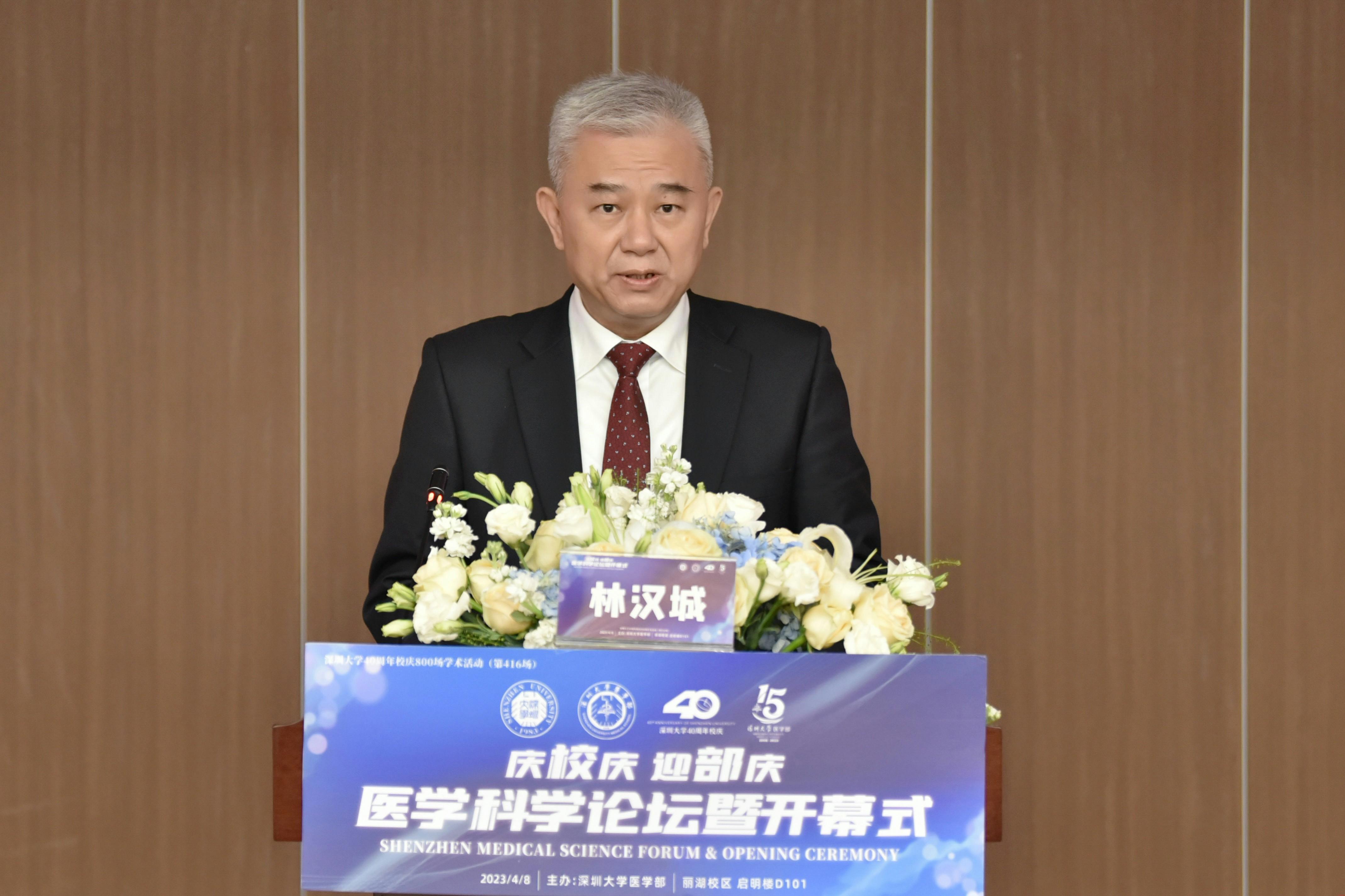 林漢城代表深圳市衛健委致辭。他表示,習近平總書記對健康中國建設極為重視,多年來深圳衛生健康系統在此指引下,著力推動衛生健康事業發展方式從“治病為中心”向“健康為中心”轉變,從體系、教育、人才、科技,信息化建設各方面建設更加優質的衛生健康保障。他欣慰地看到作為深圳衛生健康體系重要部分的深圳大學醫學部的蓬勃發展,也希望以此次醫學科學論壇系列學術活動為契機搭建高端交流平臺,持續推動大灣區及國家衛生健康事業的發展。