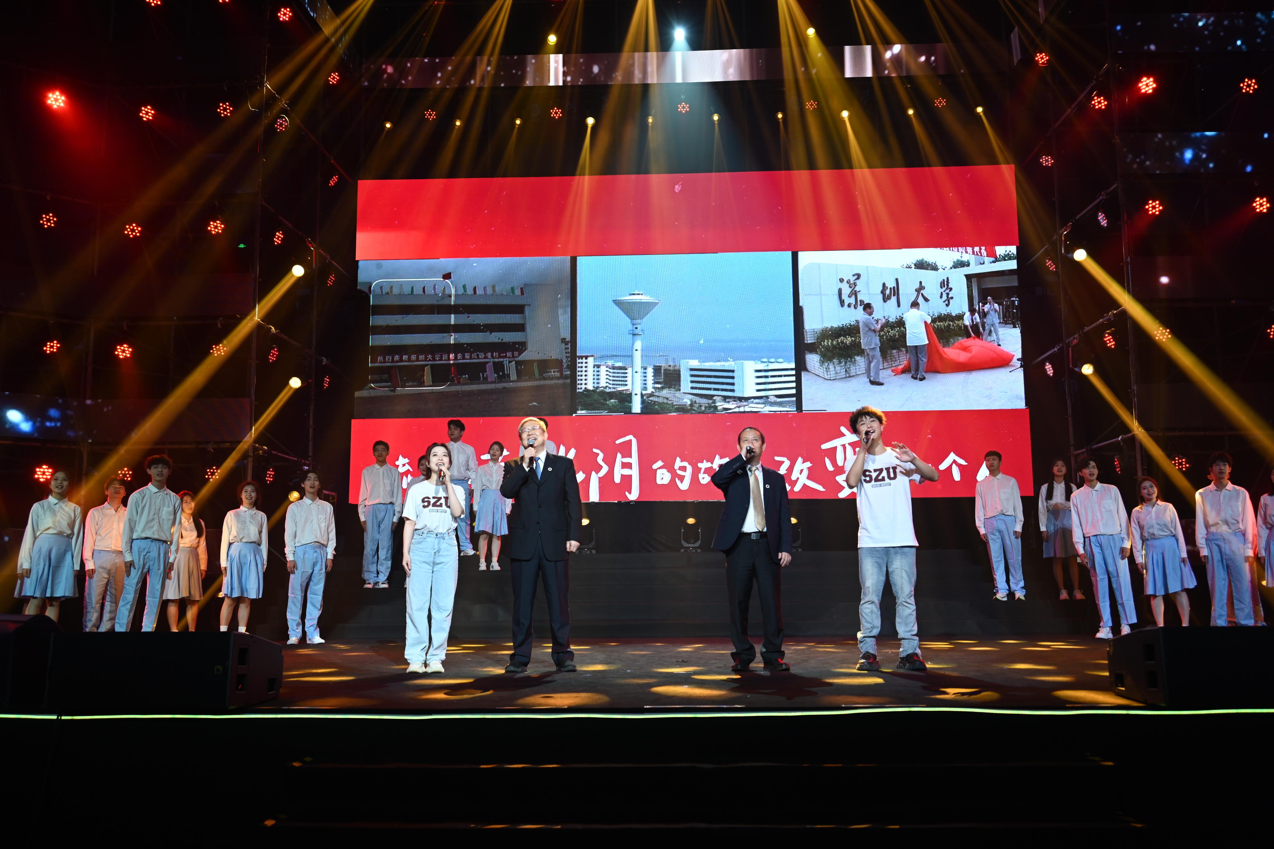 “流水它帶走光陰的故事,改變了我們,就在那多愁善感而初次回憶的青春……”晚會最大的亮點當屬合唱歌曲《光陰的故事》——深圳大學黨委書記李清泉、校長毛軍發與現場嘉賓、師生校友共同唱響深大四秩年華的朝暮與往昔,將晚會氣氛推向高潮。搖動的手機燈光如同夜空繁星,動人的場景濃縮著愛意,現場師生和校友情不自禁加入合唱,青春的旋律響徹荔園。