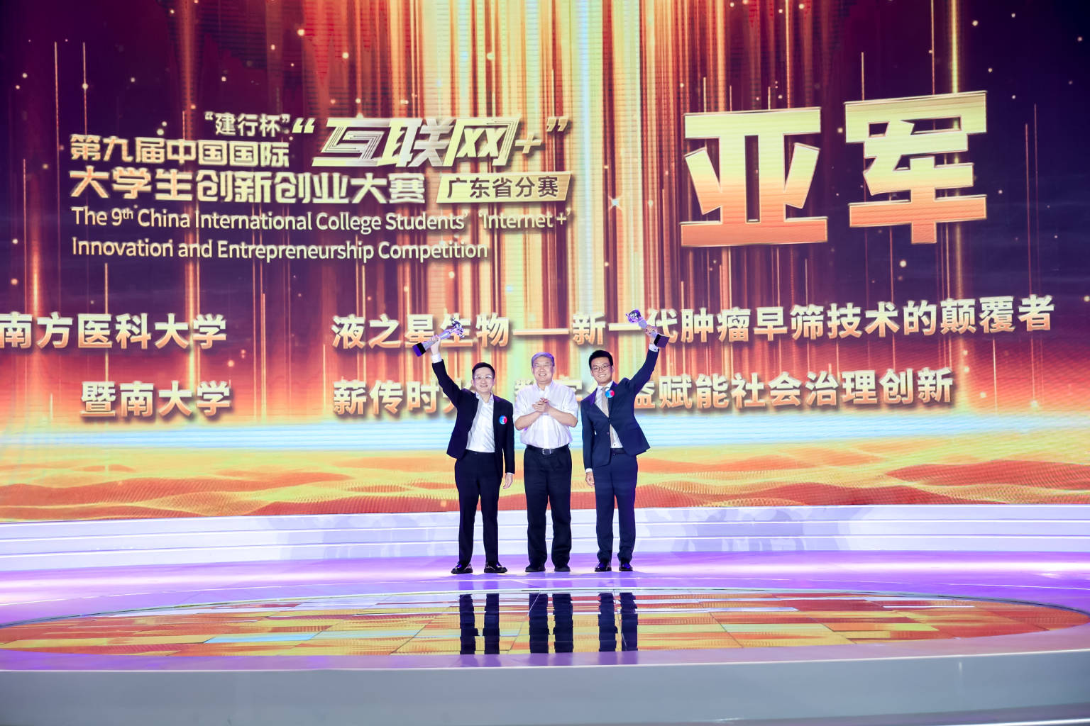 作為本屆“互聯網+”廣東省分賽的巔峰之戰,冠軍爭奪賽可謂高手過招、強強對決。現場座無虛席,氣氛熱烈,處處洋溢著青春的活力和熱情。經過兩個小時的激烈角逐,深圳大學“水利萬物”項目以1125分的高分超越其他對手斬獲冠軍,也是本次冠軍賽6個項目中唯一一個得分超過1000分的項目。南方醫科大學“液之星生物”項目、暨南大學“薪傳時光”項目均以930分獲得亞軍,華南理工大學“綠色氫能”項目、廣東工業大學“Eolink”項目、深圳職業技術學院“鉚大師”項目獲得季軍。此外,華南理工大學等15所普通本科院校和廣東輕工職業技術學院等15所職業院校獲得學校集體獎。昨日的金獎爭奪賽還產生了高教主賽道、“青年紅色筑夢之旅”賽道、職教賽道、產業命題賽道共136個金獎(有項目分數相同并列獲獎,因此比既定金獎數量多1個)。據悉,廣東省將有80個左右的項目進軍國賽,部分項目已具備沖擊“國金”實力。