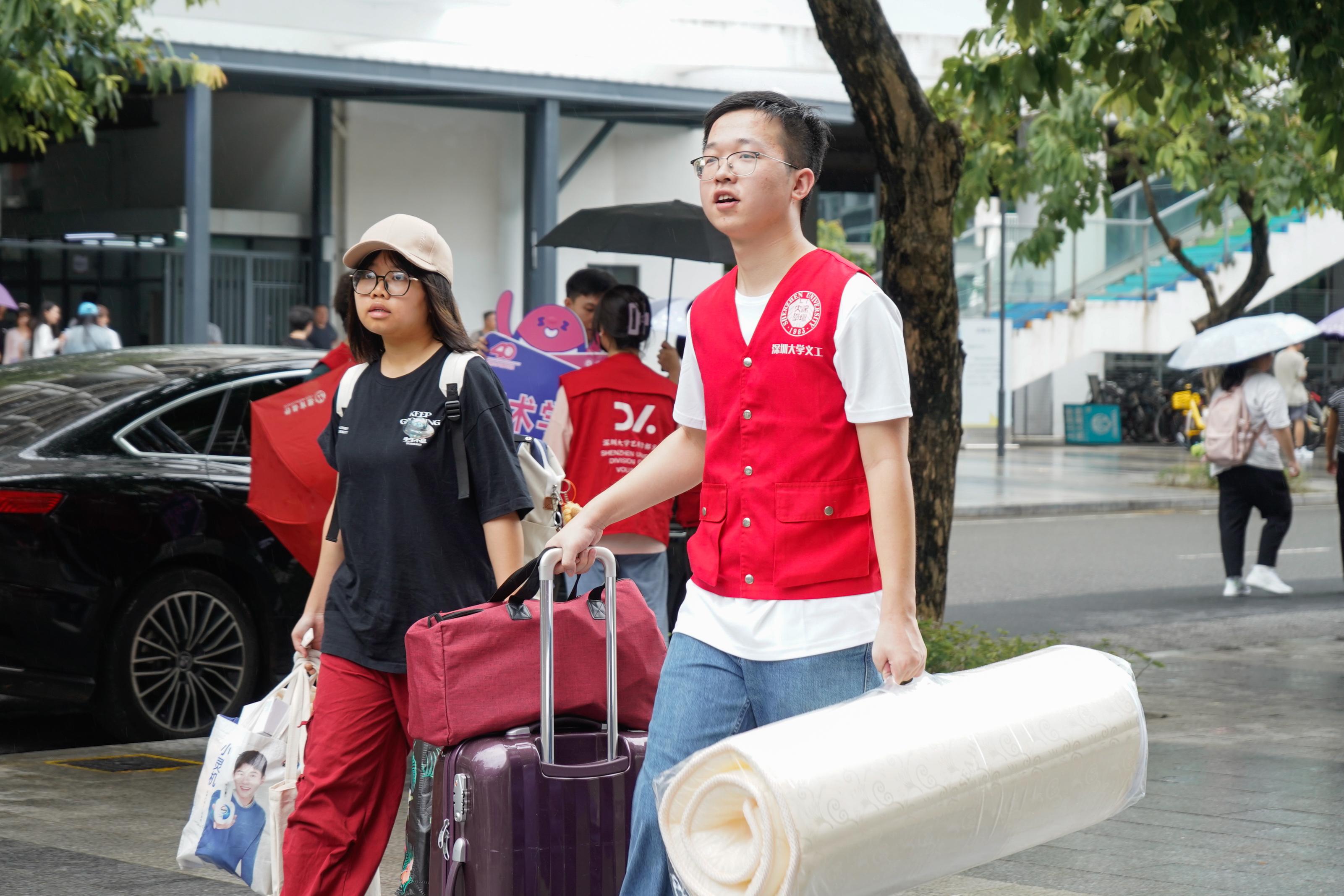 在智慧化迎新方面,深大還推出了“科技與狠活兒”。在粵海校區南區,只見一個造型硬朗的機器人拖著行李艙、“手”持小旗幟,正將新生的部分行李運往宿舍,下雨的時候它甚至還能“撐傘”防止行李淋濕。2020級機電與控制工程學院同學介紹,這是深圳大學RobotPilots機器人實驗室創新研發的工程機器人,是深大人自主設計、自主研發的成果,今年8月在全國大學生機器人大賽機甲大師超級對抗賽中進入全國八強。袁嘉恒說,該工程機器人能夠負荷70kg左右的重量,能在迎新工作中幫大家節省人力。