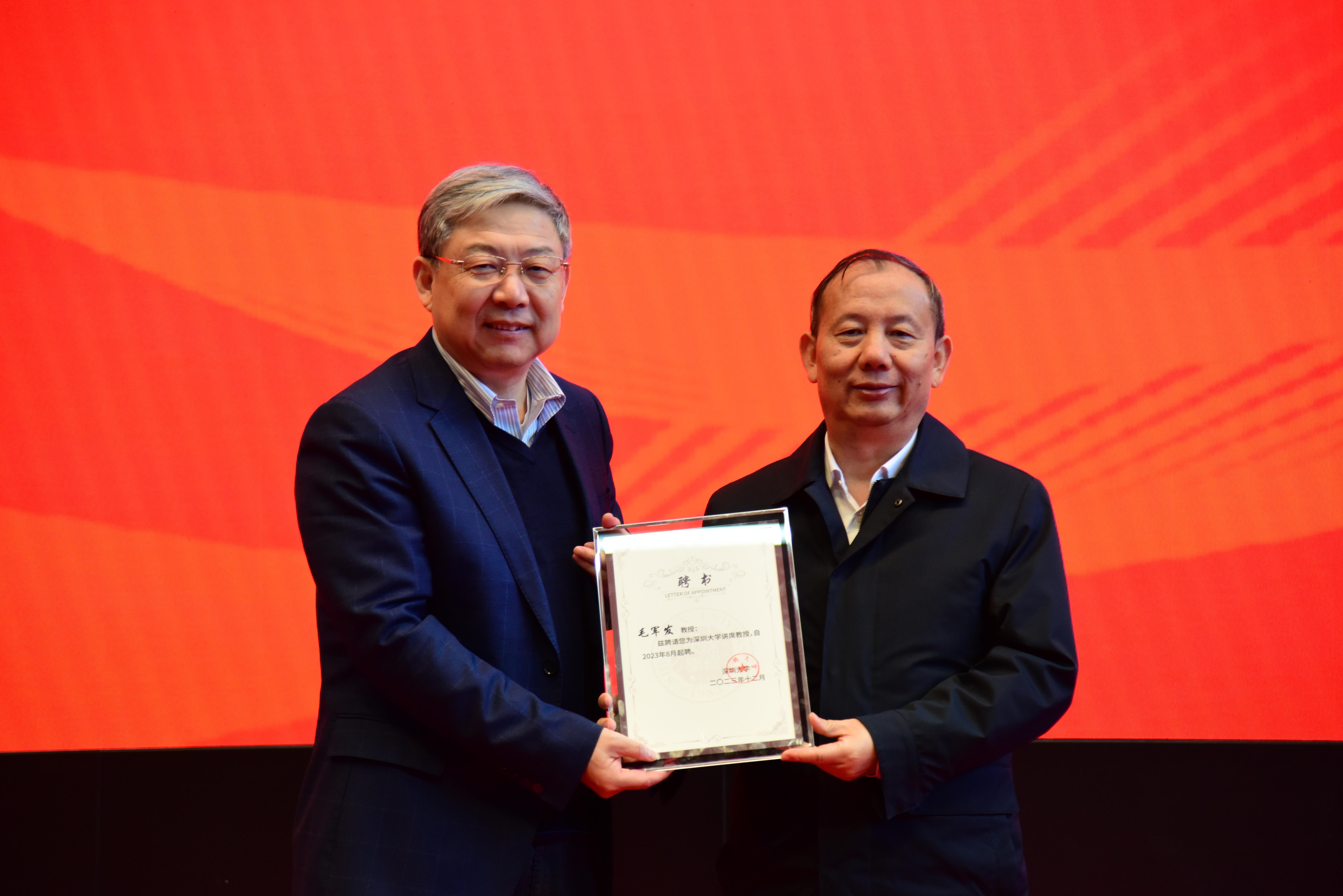 此外,為深入實施人才強校戰略,圍繞“十四五”規劃建設高水平綜合性大學,構筑一流師資隊伍,拓寬高層次人才引進和培育渠道,激發各單位引才工作的積極性和主動性,為一流大學建設提供更有力的人才支撐,深圳大學根據深圳市人才伯樂獎相關政策設立深圳大學荔園伯樂獎,獎勵對象為在學校高層次人才引進和培育工作中作出突出貢獻的校內單位。醫學部、機電與控制工程學院、材料學院、計算機與軟件學院、土木與交通工程學院、高等研究院、教育學部、心理學院、管理學院、政府管理學院等10個學院獲2023年深圳大學荔園伯樂獎,毛軍發為獲獎單位代表頒獎。