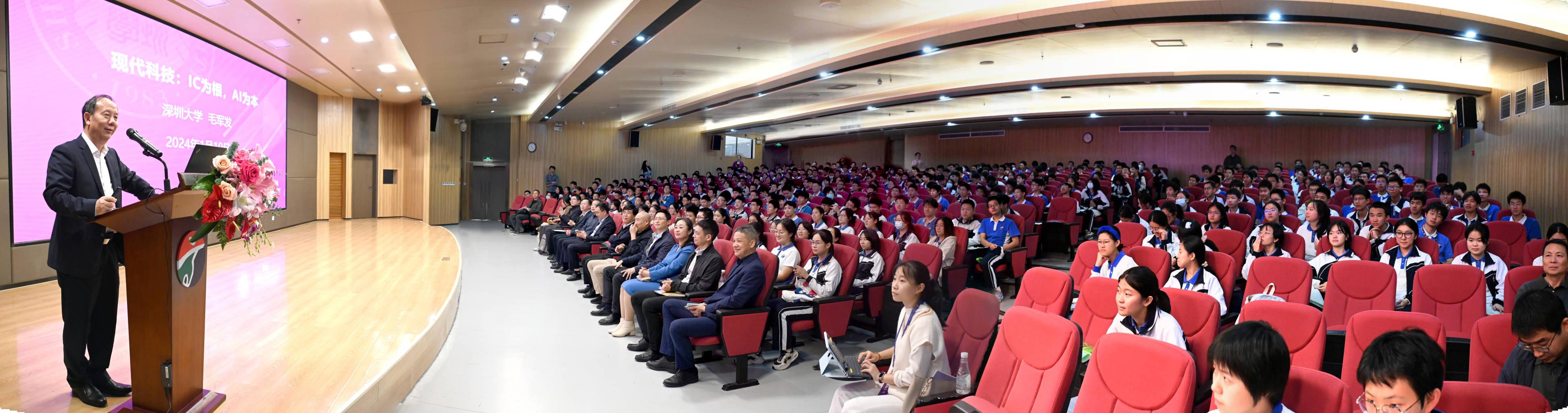 1月10下午,深圳大學校長、中國科學院院士毛軍發應邀到深圳高級中學(以下簡稱“深高”)開展講座,以“現代科技:IC為根,AI為本”為題講授現代科技發展的現狀與未來。深圳高級中學(集團)黨委書記邵愛國,黨委副書記、校長宋德意參加活動,近四百名深高師生現場聆聽講座。