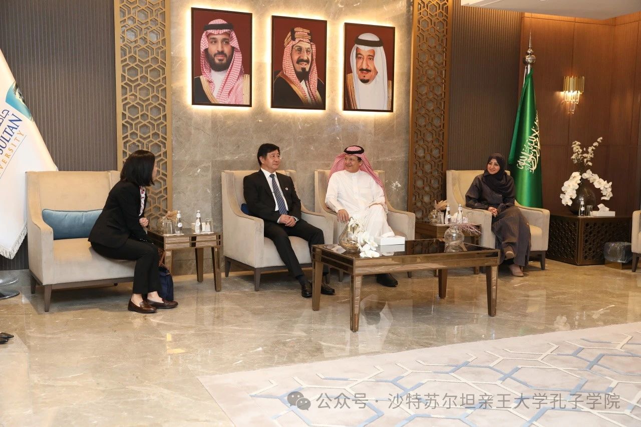 上午9點,深圳大學代表團一行抵達蘇爾坦親王大學,代表團受到蘇爾坦親王大學校長Armed Yamani博士的熱烈歡迎,并在蘇爾坦親王大學學術事務副校長Mohamad Aljebreen博士、女校校長Heba Khoshaim博士、國際部主任Tasneem Alsaati女士、沙特蘇爾坦親王大學孔子學院(簡稱“沙特孔院”)中外方院長、各學院院長的陪同下進行會面。