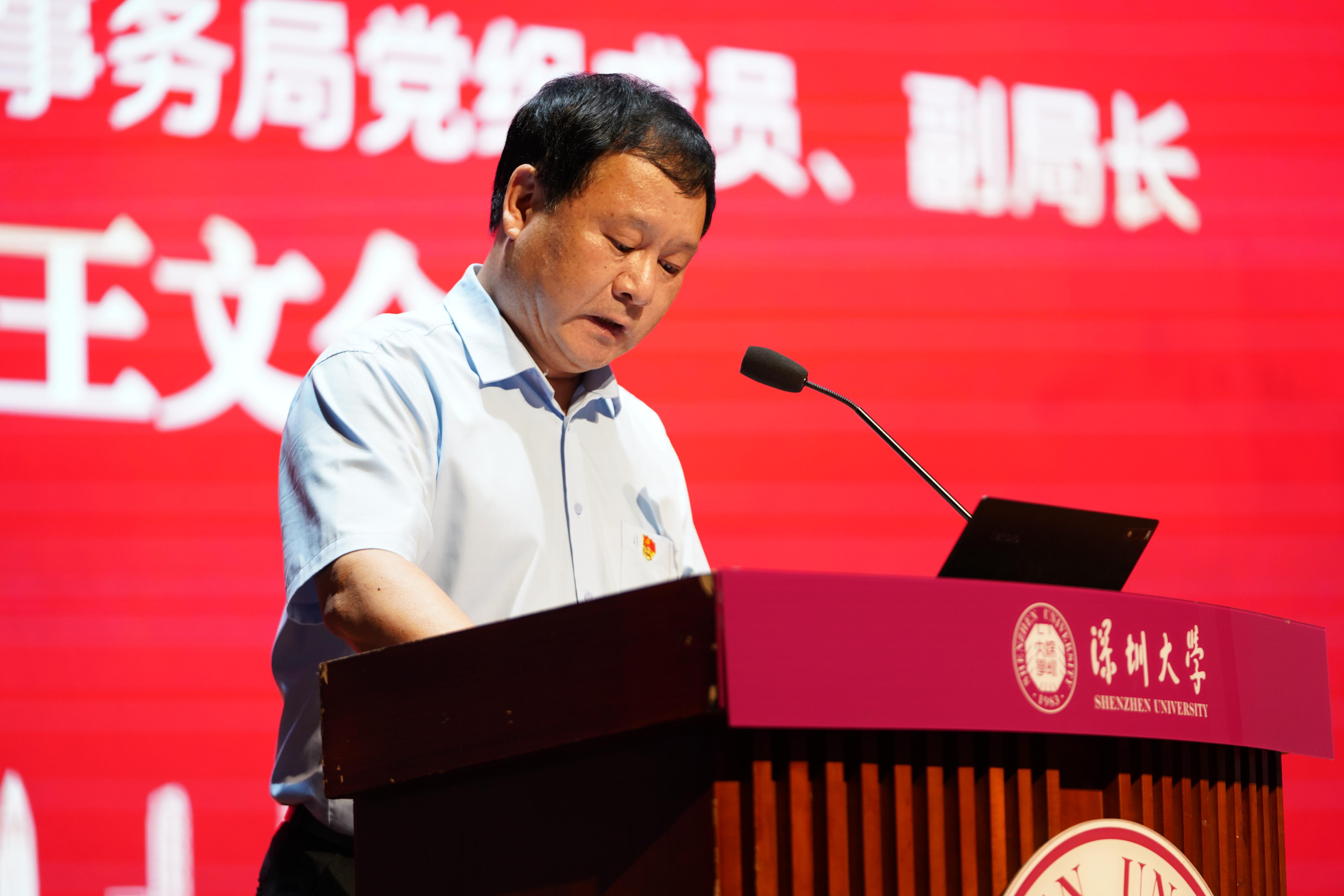 6月18日,由深圳市關愛行動公益基金會(下稱“關愛基金會”)聯合愛心伙伴單位承辦的“老兵永遠跟黨走——深圳退役軍人‘百人講師團’五進宣講”活動走進深圳大學,在粵海校區國際會議廳舉辦。深圳市退役軍人事務局黨組成員、副局長王文全,深圳大學黨委副書記吳報水,深圳市關愛行動公益基金會理事長、市商務服務類行業協會聯合黨委第一書記張占恒出席活動。深圳退役軍人“百人講師團”講師劉坤德、周順斌、段亞兵以親身經歷圍繞深圳兩萬基建工程兵“拓荒史”,講述特區初創時期可歌可泣的奮斗故事。深圳大學300名學生現場聆聽。
