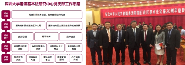 支部以“五講五力”的新型智庫黨建工作體制機制,將黨建與智庫業務有機結合,走出了一條以特色黨建引領特色智庫建設、以高水平智庫助推高質量黨建的融合之路。中心兩度獲得“深圳市教育工作先進單位”稱號,中心的咨政成果入選2021年中國智庫特色案例“咨政建言”、是入選2022“中國智庫索引”高校智庫百強A+中唯一聚焦于港澳研究的機構,建有全國最大、最齊全的基本法研究專題數據庫。