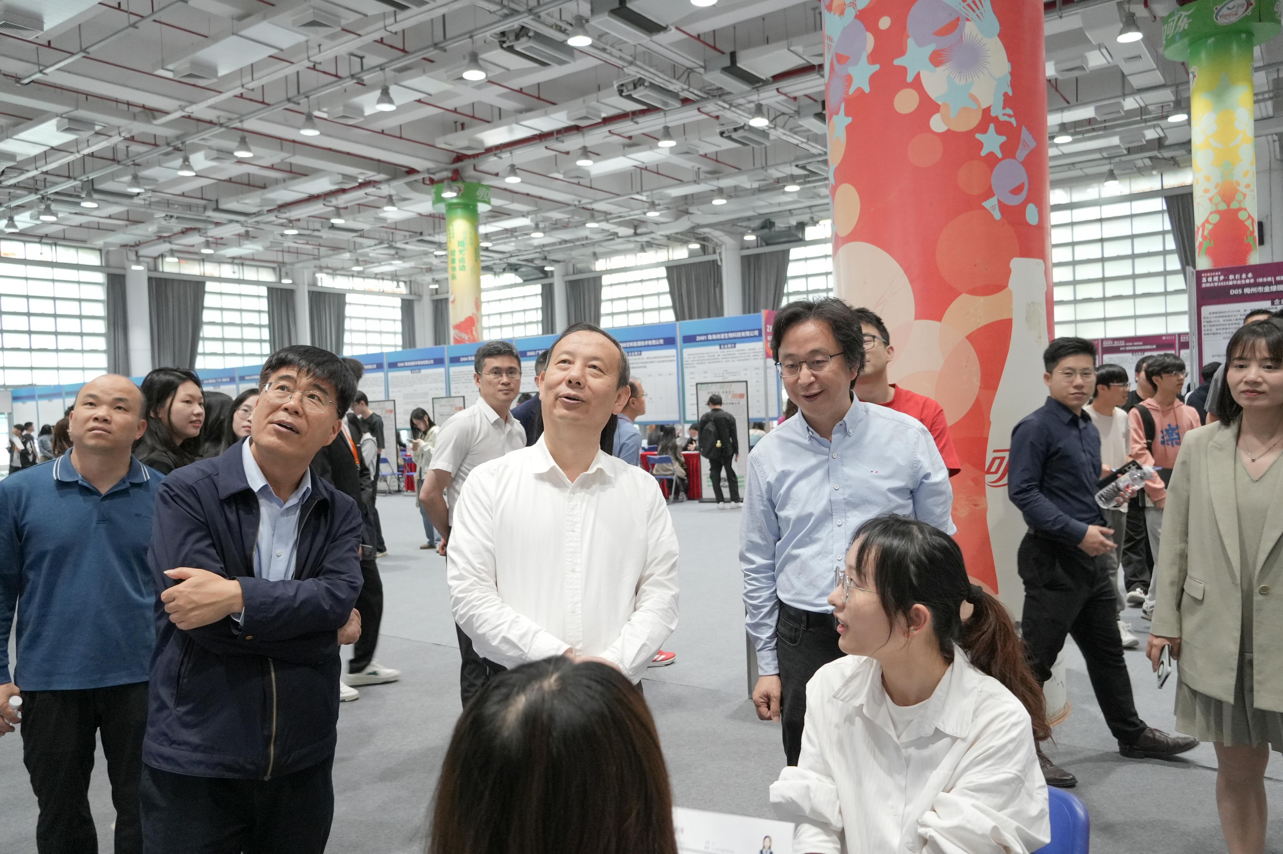 毛軍發、汪永成與企業代表及學生現場交流,了解招聘需求與求職進展,并強調,就業是最重要的民生工程,深圳大學始終堅持“以學生為中心”,將進一步加強校企協同,推動人才培養與產業需求“無縫對接”。在中興通訊展位前,毛軍發與計算機與軟件學院應屆畢業生黃同學親切交談。黃同學曾參軍兩年,退伍后重返校園,人工智能相關專業的他此次應聘中興通訊的海外技術支持外派崗位,“參軍經歷讓我更懂得責任與擔當,我希望用技術專長服務國家戰略!”毛軍發為他點贊:“退伍不褪色,深大學子既有家國情懷,又有硬核技能,這樣的復合型人才正是企業需要的!”