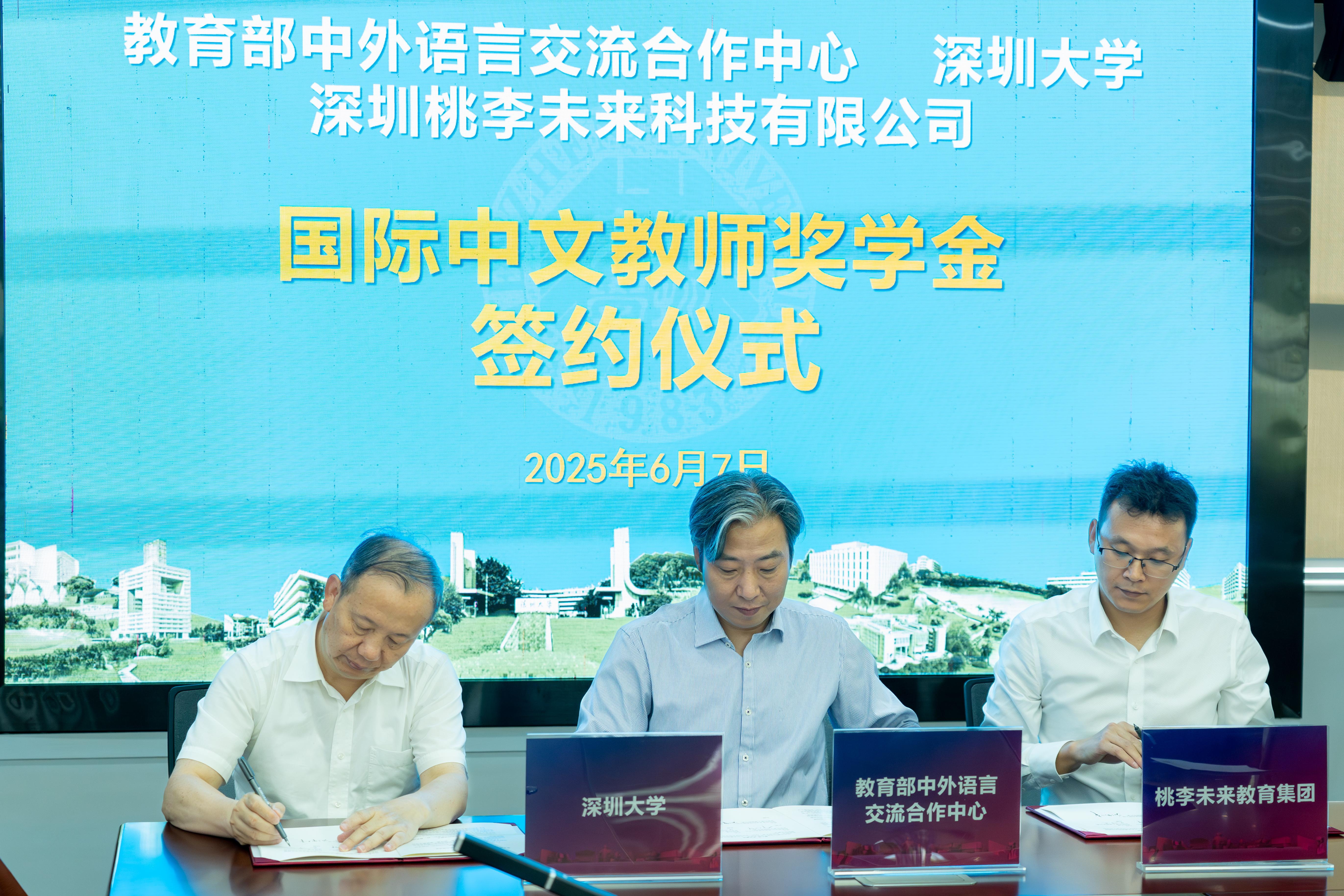 會上,教育部中外語言交流合作中心、深圳大學、桃李未來教育集團共同簽訂國際中文教師獎學金協議并合影留念。教育部中外語言交流合作中心教學與資源處、獎學金處相關負責人,深圳大學國際交流與合作部、國際交流學院相關負責人,桃李未來教育有限公司總經辦、總經理、品牌運營負責人出席并共同見證簽約。