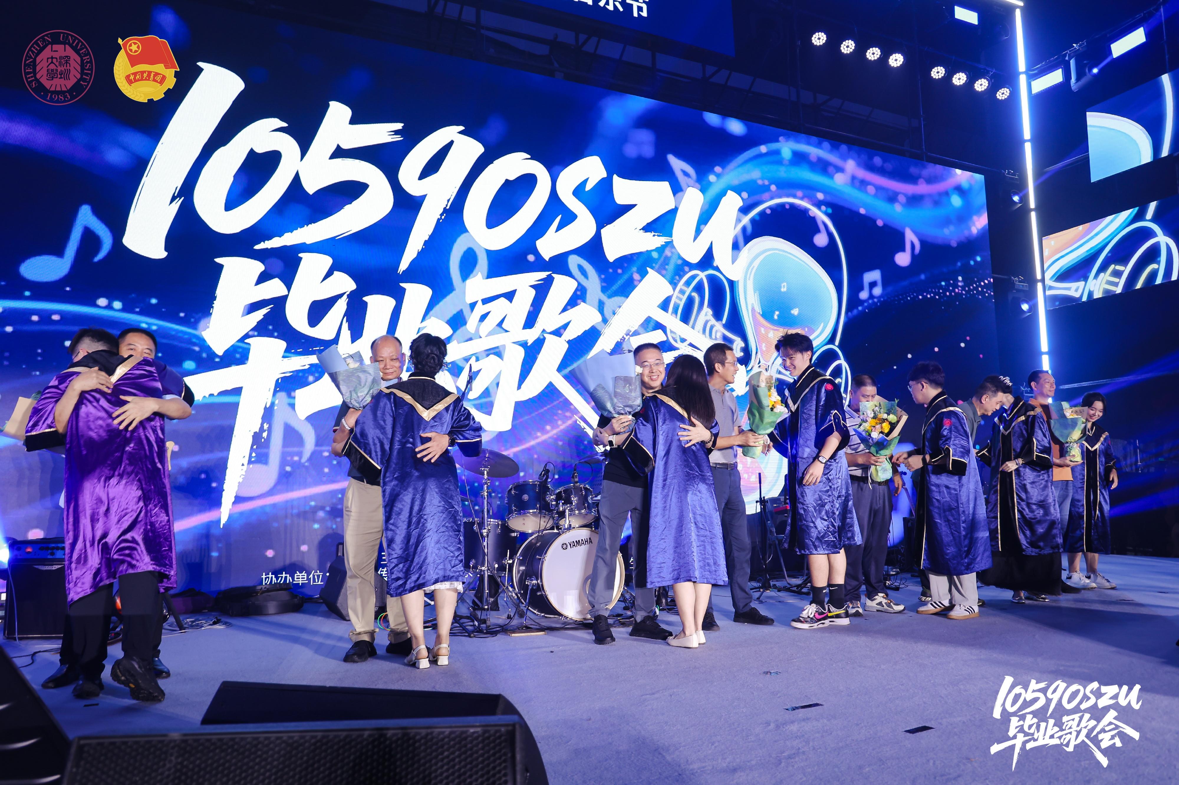 “毛校長,明天我們依然愛您!”“深大永遠愛你們!”動情的演唱、澎湃激情的回答,歌會高潮迭起。毛軍發攜手何沐陽、郎昆同臺演繹《明天你是否依然愛我》,三位嘉賓用歌聲寄語畢業生:無論未來走向何方,母校永遠是你們溫暖的港灣!
