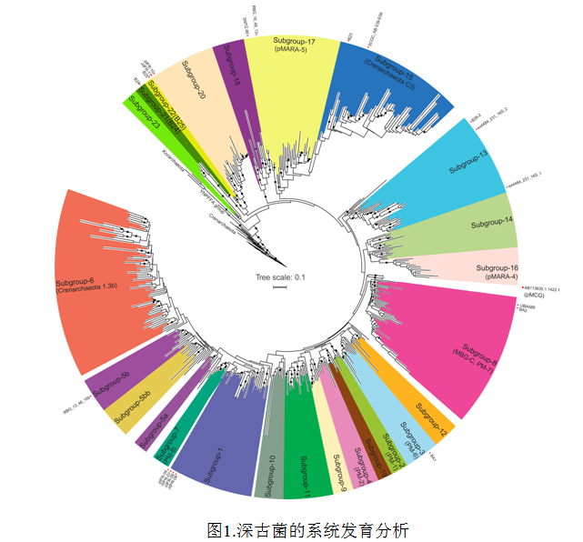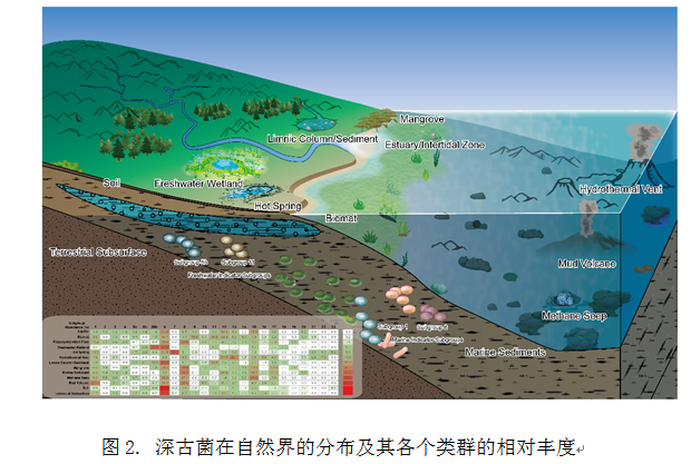 深古菌(Bathyarchaeota)是2014年被命名的一大類新的古菌門,具有極高的種群多樣性,目前已發(fā)現(xiàn)多達25個亞群。深古菌廣泛分布于全球各類沉積物中,具有多種生理生化功能潛能,是地球碳元素循環(huán)的重要驅(qū)動力之一。2016年李猛教授作為共同第一作者與上海交通大學(xué)王風平教授團隊開展合作,在國際著名刊物Nature Microbiology(DOI: 10.1038/NMICROBIOL.2016.35)發(fā)表論文揭示深古菌產(chǎn)乙酸等代謝機制,得到國內(nèi)外同行的廣泛關(guān)注。在此基礎(chǔ)上,李猛教授團隊受邀撰寫深古菌的綜述性評論文章,該文章系統(tǒng)地對現(xiàn)有深古菌研究進行了整理歸納,給出了迄今為止最完善的深古菌系統(tǒng)發(fā)育及其代謝潛能分析(圖1)。文章從深古菌的全球分布、種群多樣性、分布規(guī)律和分子探測方法、生理生化和基因組特征,、生態(tài)功能和進化方面進行了詳細分析和總結(jié)(圖2),并指出了富集培養(yǎng)、甲烷代謝功能和進化以及亞群的生態(tài)功能這三個后續(xù)主要研究方向。本篇評論也是近5年來 FEMS Microbiology Reviews上由中國學(xué)者獨立完成發(fā)表的4篇論文之一。