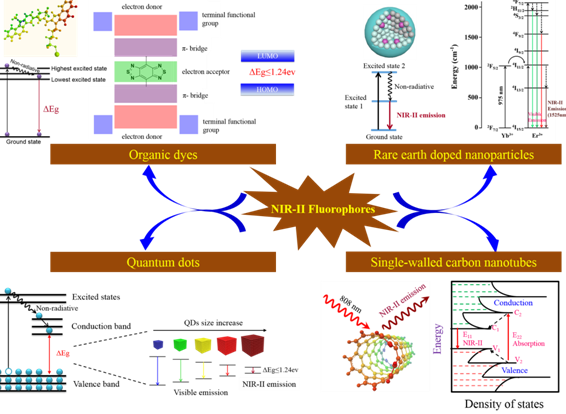 熒光成像主要依靠熒光探針標(biāo)記技術(shù)跟蹤觀察生物組織和細(xì)胞中感興趣區(qū)域的變化信息。熒光成像不僅快捷簡(jiǎn)便,無(wú)輻射損傷,而且靈敏度高,能夠?qū)崿F(xiàn)病變組織的早期診斷和實(shí)時(shí)成像。按成像波長(zhǎng),主要分為可見光成像(400-700nm),近紅外一區(qū)成像(700-1000nm)和近紅外二區(qū)成像(1000-1400nm和1500-1700nm)。與可見光和近紅外一區(qū)相比,近紅外二區(qū)具有更弱的生物組織吸收和散射作用,更深的穿透深度和更高的信噪比。近年來,近紅外二區(qū)熒光探針取得了巨大進(jìn)展,主要包括(附圖):有機(jī)染料分子(organic dyes),稀土摻雜納米顆粒(rare earth doped nanoparticles), 量子點(diǎn)(quantum dots)和單壁碳納米管(single-walled carbon nanotubes)。另外,光電探測(cè)及成像技術(shù)的發(fā)展,也為近紅外二區(qū)成像的發(fā)展和應(yīng)用奠定了基礎(chǔ)。本課題組在前期工作的基礎(chǔ)上,系統(tǒng)總結(jié)了各種近紅外二區(qū)熒光探針的發(fā)光機(jī)理與制備方法,詳細(xì)介紹了其在生物成像、疾病診療中的應(yīng)用,并討論了近紅外二區(qū)熒光探針的設(shè)計(jì)與構(gòu)建的基本策略以及它們?cè)谂R床轉(zhuǎn)化應(yīng)用中所面臨的機(jī)遇和挑戰(zhàn)。