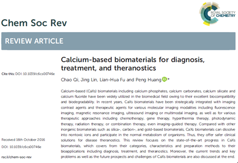 近日,深圳大學醫學部生物醫學工程學院黃鵬特聘教授團隊在Chemical Society Reviews(影響因子38.618,中科院JCR 1區,TOP期刊)上發表了題為《Calcium-based biomaterials for diagnosis, treatment, and theranostics》的綜述性學術論文(DOI: 10.1039/c6cs00746e)。深圳大學是唯一單位和唯一通信單位,該團隊漆超博士是第一作者,黃鵬教授為通訊作者,該團隊所在的生物醫學工程學科屬于廣東省優勢重點學科。