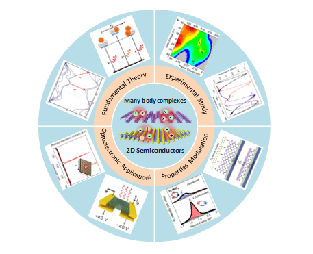 石墨烯的發(fā)現開啟了二維材料世界的大門。此后,大量的二維材料及其新奇的特性被相繼發(fā)現,涵蓋金屬、半導體和絕緣體等。其中,過渡金屬二硫化物(TMDs)和黑磷(BP)由于其固有的帶隙和獨特的性質在光電子應用中具有巨大的潛力,在“后石墨烯時代”引起了極大的關注。在二維尺度上,半導體的光電特性會發(fā)生顯著變化,如由間接帶隙變?yōu)橹苯訋叮═MDs)或帶隙能量隨層數可控(BP)。由于維度的降低,材料內部的介電屏蔽效應顯著減少、電子-空穴的庫侖相互作用顯著增強,二維半導體內的多體復合結構(激子,帶電激子,雙激子等)的結合能顯著提升,使得它們不僅能夠在室溫下穩(wěn)定存在,并且對材料的光學和電學性質起到決定作用。此外,二維半導體的原子級厚度和極大的比表面積使得這些多體復合結構的特性對于外界刺激非常敏感,可基于此實現新穎的光伏、檢測、傳感等器件的開發(fā)。為了充分應用二維半導體在光電子學中的潛在功能,必須全面了解其內在的多體復合結構。本文綜述了近期二維半導體中多體復合結構相關的前沿研究進展,包括基礎理論、實驗研究、性能調控和光電應用四個方面。首先,理論總結了TMDs和BP的電子結構和激子效應;然后討論了表征多體復合結構的主要實驗技術以及擴散動力學;接下來歸類了三種二維半導體材料特性的調控方法和代表性的光電應用。最后,展望了該領域的當前挑戰(zhàn)和未來前景,為潛在的研究方向提供進一步的建議。