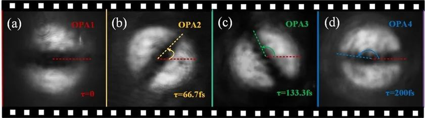 時序圖像的拍攝速度/頻率主要取決于相鄰兩個光學延遲線之差。實驗上,該系統實現了15萬億幅/秒的有效攝影頻率,這創造了高空間分辨相機有效攝影頻率的新記錄。時間分辨率取決于觸發各級OPA和產生閑頻光的激光脈沖寬度。本實驗該脈沖寬度為50fs(五千萬分之一納秒)。結合超高的攝影頻率,該系統可以觀測諸多超快物理現象。該研究團隊展示了利用該裝置實現對等離子體光柵和旋轉速度為10萬億弧度/秒的旋轉光場(如圖2所示)。