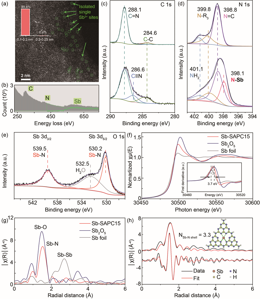 Sb-SAPC15的高分辨掃描透射高角度環形暗場像中亮點的大小部分均小于0.2 nm。Sb-SAPC15的電子損失譜說明該區域由C, N, Sb構成,也表明Sb元素存在于PCN的結構中 (圖 4a-b)。 圖4c-e, PCN的高分辨率C 1s(c)和N 1s 光電子能譜光譜(d)和Sb-SAPC15的Sb 3d XPS光譜說明,Sb可能與N原子成鍵,且化合價接近+3 (圖4c-e)。Sb箔, Sb2O5和Sb-SAPC15的Sb-K邊 X射線近邊吸收譜和精細結構譜表明XANES和傅立葉變換擴展X射線吸收精細結構(FT-EXAFS)光譜(圖4 f-h)進一步說明了Sb的價態接近+3。從DFT優化獲得的模型擬合Sb-SAPC15的EXAFS數據說明,Sb與周圍N原子的平均配位數為3.3。