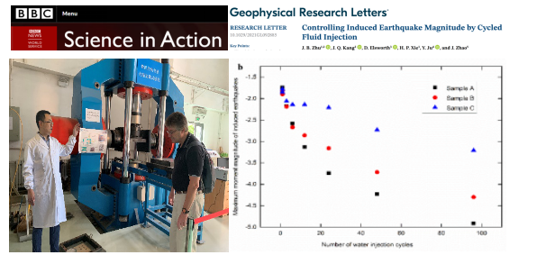 近年來,油氣開采、深部地熱能開發、深部采礦等工程擾動誘發地震引起國內外普遍關注,成為國際前沿研究熱點。在珠江人才計劃創新創業團隊項目“工程擾動巖石動力學理論與技術”等支持下,謝和平院士團隊基于自主研發的疲勞變頻注水擾動誘發地震試驗系統,開展了注水擾動誘發斷層失穩滑動研究。BBC節目Science in Action于2021年9月23日用八分鐘時間報道了相關最新研究成果。