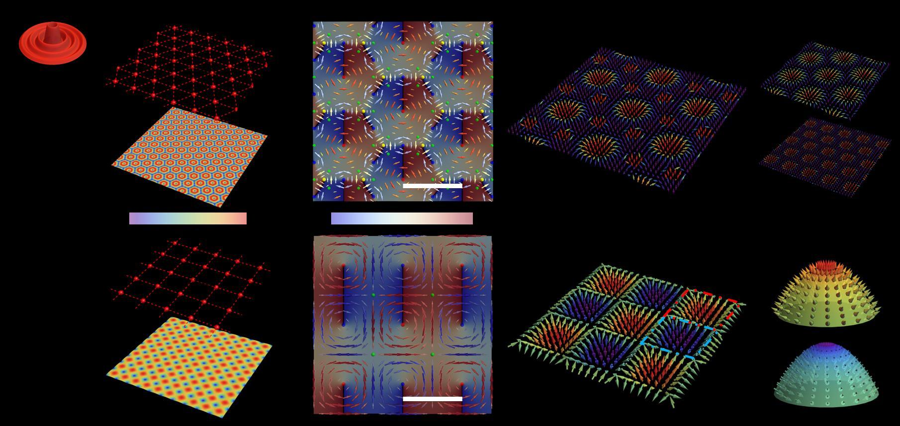 在凝聚態體系中,晶體各向異性能和相鄰自旋磁矩的耦合作用決定了不同磁疇結構的形成,如磁性斯格明子(skyrmion)、半子(meron)等,而光學自旋拓撲的形成機理尚未得到有效的論證。該研究表明,由于旋轉對稱性破缺,六角及四角對稱下的近場自旋-軌道耦合將分別形成Abrikosov及Staggered型的能流渦旋分布。根據廣義的自旋-動量綁定,兩種能流結構分別對應光學自旋skyrmion及meron陣列(圖1)。同時,通過求解方形邊界下能量哈密頓量的極值,可以得到與理論預測一直的自旋meron結構。該研究揭示了自旋拓撲光子學新物理,為光學體系下的自旋拓撲特性的研究提供了新思路,在光學位移傳感、磁疇檢測、量子技術等領域具有重大的應用前景。
