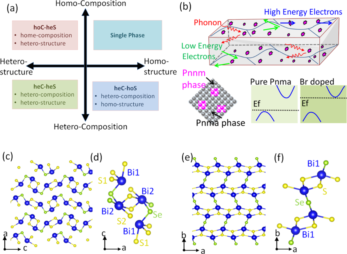 圖1 Bi2SeS2的納米組成和晶體結(jié)構(gòu)示意圖。(a)根據(jù)納米復(fù)合材料的基體相和納米析出相的晶體結(jié)構(gòu)和化學(xué)組成差異分類的三種納米復(fù)合材料。目前大多數(shù)報(bào)道的納米復(fù)合材料屬于異成份和同結(jié)構(gòu)(heC-hoS)或異成分和異結(jié)構(gòu)(heC-heS)。(b)PnmaBi2SeS2-PnnmBi2SeS2(hoC-heS)納米復(fù)合材料內(nèi)部輸運(yùn)機(jī)制的結(jié)構(gòu)和示意圖。(c-d)Bi2SeS2Pnma相在ac晶面的晶體結(jié)構(gòu)。(e-f)Bi2SeS2Pnnm相在ab晶面的晶體結(jié)構(gòu)。