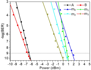 全光邏輯是全光信號處理中的基礎性技術,也是關鍵技術之一。在光網絡的各個層,都會涉及到與光邏輯有關的信號處理。如全光復用/解復用/分插復用、碼型轉換、波長轉換、2R再生(再整形、再定時)、全光判決、數據包交換、光標簽、包頭提取、包頭識別、全光采樣等。此外,全光邏輯也是實現全光計算的重要方法。全光計算技術采用光學方法實現對光數據信息的運算處理,具有并行處理、高速度、大容量、空間傳輸和抗電磁干擾等優點。基于該高非線性硅基聚合物狹縫波導中的四波混頻效應,團隊實現了速率為40Gb/s的高速兩輸入全光標準邏輯單元運算。實驗方案如圖5所示。圖6展示的邏輯結果碼流正確、眼圖清晰張開,所有邏輯運算結果均達到無誤碼狀態。該高非線性硅基聚合物狹縫波導在未來超快片上全光信號處理中將具有重要的應用前景。