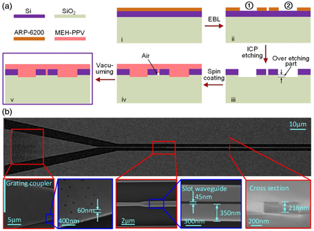 器件的工藝流程及SEM圖如圖2所示。最終制備的器件狹縫寬度為45nm,狹縫深度218nm,硅波導寬度為350nm,MEH-PPV厚度250nm。