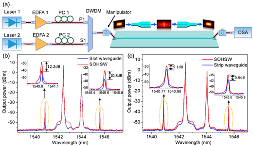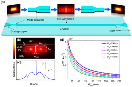 近日,深圳大學物理與光電工程學院徐平教授團隊與武漢光電國家研究中心張新亮教授團隊合作,在硅基非線性光學器件領域取得重要研究進展,在《Photonics Research》(IF: 7.08, 中科院Top 1區,10(1), pp. 50-58 (2022)) 發表了題為“Enhanced optical nonlinearity in a silicon–organic hybrid slot waveguide for all-optical signal processing”的研究論文。該論文提出了一種高非線性硅基聚合物狹縫波導(SOHSW),當狹縫波導的波導(高折射率材料)與狹縫(低折射率材料)折射率差較大,且狹縫尺寸較小時,界面處的電場不連續從而產生突變,狹縫區發生電場疊加,使得光場得到有效增強。同時,將狹縫中填充高非線性聚合物MEH-PPV(Nonlinear indexn2=8.5±0.4×10?17m2∕W),進一步增強器件的非線性特性。器件結構如圖1(a)所示。普通的硅基非線性器件會受到硅本身產生的雙光子吸收效應(TPA)和由此產生的自由載流子吸收效應(FCA)的影響,從而導致非線性過程轉換效率降低。而本文中,如圖1(b)和1(c)所示,高非線性硅基聚合物狹縫波導主要將光場能量限制在狹縫中傳播,大大降低了TPA和FCA的影響,且狹縫越窄,對光場的限制能力越強。