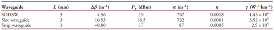 該工作比較了3mm長度下,提出的高非線性硅基聚合物狹縫波導、未填充聚合物的狹縫波導以及普通條形波導(220nm×450nm)的非線性系數。非線性系數測試及計算通過兩束連續光的簡并四波混頻實現。實驗方案及測試結果如圖3所示,從結果可以看出,該工作提出的高非線性硅基聚合物狹縫波導的四波混頻轉換效率,相對于未填充聚合物的狹縫波導以及普通條形波導,分別提高了12dB和5dB以上。由四波混頻轉換效率計算得出,高非線性硅基聚合物狹縫波導的非線性系數可達1.43×1061/W/km,是未填充MEH-PPV時非線性系數的4倍,是普通條形波導的近6倍。