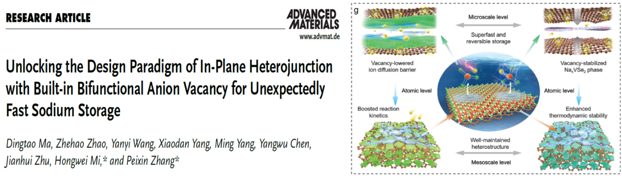 1.為解決過(guò)渡金屬化合物作為鈉離子電池負(fù)極材料容量低和循環(huán)性能差等問(wèn)題,提出了一種獨(dú)特的原位功能化和自限生長(zhǎng)方法,以V2CTxMXene為模板,設(shè)計(jì)了具有內(nèi)嵌陰離子空位的VSe2-x/C面內(nèi)異質(zhì)結(jié),在加硒過(guò)程中,V2CTx的碳原子層轉(zhuǎn)化為超薄的導(dǎo)電碳,最大限度地與生成的VSe2組分面對(duì)面接觸。同時(shí),碳還原環(huán)境的自發(fā)形成削弱了V-Se鍵,產(chǎn)生了豐富的Se陰離子空位結(jié)構(gòu),雙功能陰離子空位與面內(nèi)異質(zhì)結(jié)構(gòu)之間存在多尺度的界面協(xié)同作用,緩解了體積應(yīng)變,提高了Na+插層和后續(xù)轉(zhuǎn)化反應(yīng)的動(dòng)力學(xué)和熱力學(xué)。該成果發(fā)表在《Advanced Materials》(2023:2310336),深圳大學(xué)為第一完成單位和唯一通訊單位,馬定濤副研究員和研究生趙哲浩為論文共同第一作者,張培新教授和米宏偉副教授為共同通訊作者。論文鏈接:https://doi:10.1002/adma.202310336