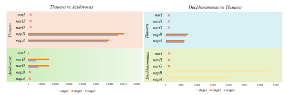 這些結果表明:硝酸鹽作為唯一的電子受體,基本上被100%去除。但SO42-導致硝酸鹽去除率降低到90% 以下。硫酸鹽負載取代了Dechloromonas(第一階段)和Thauera(第二和第三階段)作為優勢屬,而它們都包含編碼反硝化酶的所有功能基因。此外,Acidovorax 也是優勢屬(第2階段和第3階段),但它的豐度遠不如Thauera。編碼硝酸鹽還原酶的基因在所有階段都是最豐富的,但隨著SO42-的增加而減少。其中,napB在SO42-環境下占硝酸還原酶功能基因的最大比例。相比 napA 基因,功能細菌Dechloromonas 和 Thauera具有更多的 napB 基因。因此,硫酸鹽抑制了自養反硝化作用,特別是抑制了Dechloromonas及其功能基因napB。本研究為更好地了解硫酸鹽對反硝化過程的影響,特別是關鍵微生物功能基因對硝酸鹽去除具有重要意義。