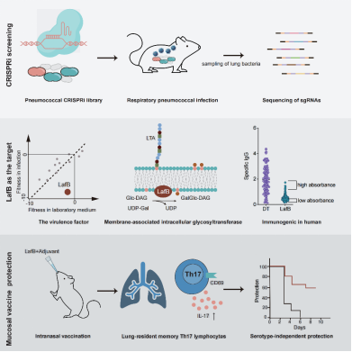 在本研究中,劉雪等特別尋找了在超級感染期間對細菌生存至關重要的保守基因,發現了lafB基因,該基因編碼一種高度保守的,定位于細胞膜的蛋白,且其對細胞壁穩態至關重要,是肺炎鏈球菌引起感染的必需基因。進一步地,研究者發現LafB蛋白可以針對超級感染提供廣譜的免疫保護。免疫保護作用機制的相關研究發現,LafB蛋白免疫小鼠之后可以誘導具有肺部組織駐留特性的Th17細胞的免疫響應,且該響應是免疫保護所必需的。這種廣譜的Th17依賴的免疫保護機制為開發一種通用的、不依賴于血清型的肺炎鏈球菌疫苗鋪平了道路。