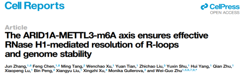 2024年2月,醫學部卡爾森國際腫瘤中心朱衛國特聘教授團隊在《Cell Reports》雜志上發表題為“The ARID1A-METTL3-m6A axis ensures effective RNase H1-mediated resolution of R-loops and genome stability”的研究論文,揭示了R-loop中RNA發生的m6A甲基化修飾對于RNase H識別R-loop并驅動R-Loop清除起到十分關鍵的作用。醫學部助理教授張俊,研究生陳鳳為本研究共同第一作者,朱衛國特聘教授為通訊作者。