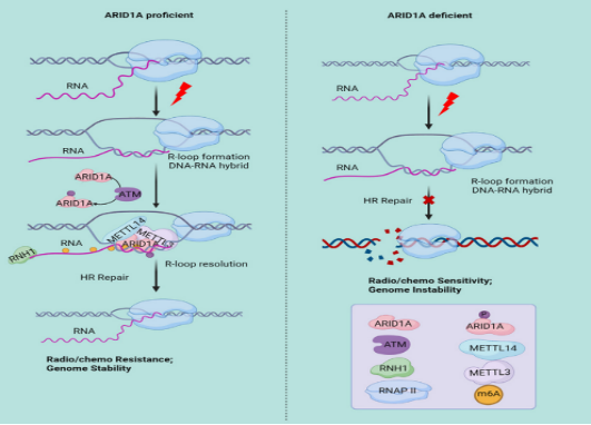 本研究首先證實了RNase H1RNase H1更傾向結合帶有m6A甲基化修飾的R-Loop,并推動R-Loop的分解以促進DSB的DNA末端切除,從而確保基因組的穩定性。機制上,該團隊鑒定出ARID1A在響應DNA損傷應激時快速識別R-Loop并進一步招募RNA甲基轉移酶METTL3/14,從而驅動R-LoopRNA發生m6A修飾。功能研究顯示ARID1A及METTL3的缺失會導致R-Loop積累,同時ARID1A-METTL3信號軸缺陷的細胞對基因毒性療法更加敏感。鑒于異常表達的ARID1A與腫瘤患者對基因毒性療法的耐藥性有關,這些發現為探索針對ARID1A異常表達癌癥的治療提供了潛在新策略(具體工作模式圖如下)。