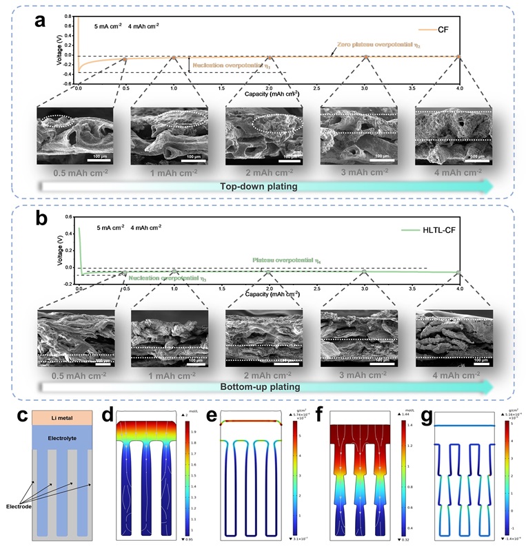 該研究將卷對卷制程以及溶液燃燒法相結(jié)合,制備了擁有多級親鋰結(jié)構(gòu)的3D集流體。該制備方法具有簡單、成本低等優(yōu)勢,易于大規(guī)模產(chǎn)業(yè)化。在鋰金屬電池中運(yùn)用該集流體作為鋰金屬的附著基底,可使電池在循環(huán)過程中,鋰金屬沉積模式由自上而下轉(zhuǎn)變?yōu)樽韵露希源舜蟠筇岣咂溲h(huán)穩(wěn)定性能以及安全性。