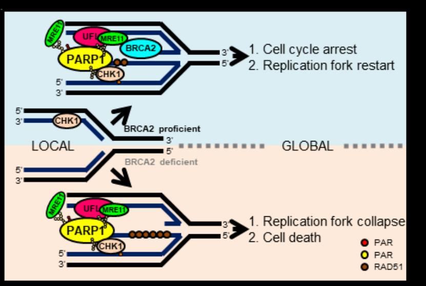 基因組DNA的高保真復制和合適的DNA復制脅迫應答是維持基因組穩定性和細胞增殖的根本保障,其異常與大多數腫瘤的發生和發展密切相關,因此,其調控網絡也是腫瘤治療的核心靶標。作為2004年才被發現的最新型類泛素修飾—UFM1修飾,至今被發現的修飾底物非常有限,卻已被證明在胚胎發育、內質網穩態、蛋白質量控制、DDR等生命活動中起重要作用,然而在DNA復制脅迫應答中的功能尚有待挖掘。在該研究中,許教授團隊發現UFM1修飾缺陷導致復制脅迫子下被阻滯的復制叉不穩定和染色體畸變率顯著升高,進一步發現多聚(ADP-核糖)聚合酶PARP1的548位賴氨酸(K548)發生UFM1修飾,該修飾促進PARP1的酶性活化和在復制叉上的招募、細胞周期檢驗點激酶CHK1的激活和核酸酶MRE11到被阻滯復制叉的招募,進而促進BRCA1/2缺陷細胞中核酸酶MRE11對被阻滯復制叉的降解,而在BRCA1/2正常細胞中促進被阻滯復制叉重啟,維持基因組穩定。肺癌病人的腫瘤細胞突變PARP1(F553L)展現出與UFM1修飾缺陷PARP1(K548R)相似的細胞表型。該研究成果揭示了UFM1修飾維持被阻滯復制叉穩定和基因組完整的作用機理,為基因組不穩定相關疾病的診治提供了新的潛在策略。