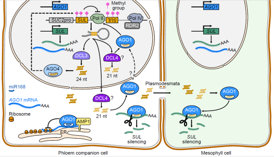該研究在尋找AMP1 及其同源物 LIKE-AMP1 (LAMP1) 在 miRNA 介導(dǎo)的翻譯抑制之外的作用時(shí)發(fā)現(xiàn),在amp1 lamp1雙突變體中,由反向重復(fù)序列引發(fā)的沉默作用加劇。作者將amp1 lamp1 植物與廣泛使用的 RNAi 報(bào)告系 SUC:SUL (SS) 雜交,其中韌皮部特異性啟動(dòng)子 (SUC) 驅(qū)動(dòng)葉綠素生物合成基因 SULPHUR (SUL;也稱為 CHLORINA42) 的人工反向重復(fù)序列 (IR) 表達(dá)。SS 轉(zhuǎn)錄本產(chǎn)生靶向內(nèi)源性 SUL 的 siRNA,導(dǎo)致明顯的葉脈萎黃,這種沉默作用是 ARGONAUTE 1 (AGO1)依賴性的。AMP1 和 LAMP1 通過(guò)抑制 AGO1)蛋白水平來(lái)抑制 Pol II 依賴的 IR 基因轉(zhuǎn)錄進(jìn)而影響SUL-siRNA的水平。AMP1/LAMP1 缺乏對(duì)SUL-siRNA的影響可以通過(guò) AGO1 過(guò)表達(dá)來(lái)重現(xiàn)。研究發(fā)現(xiàn)在人工 SS 系統(tǒng)中觀察到的 AMP1 LAMP1 突變的影響可以擴(kuò)展到內(nèi)源性反向重復(fù)序列,例如 IR71 或 At5g22960。該研究揭示了 IR - siRNA 生物合成中兩個(gè)以前未知的參與者——AGO1(促進(jìn) IR 轉(zhuǎn)錄)和 AMP1(通過(guò)抑制 AGO1 表達(dá)間接抑制 IR 轉(zhuǎn)錄)。