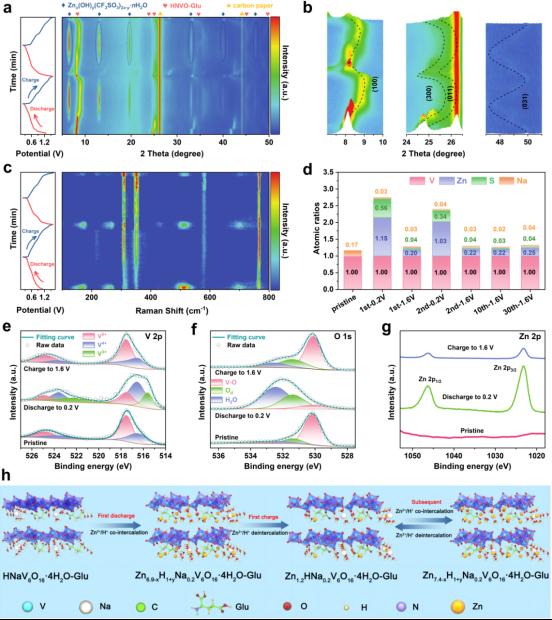 在本研究中,研究團隊通過客體材料介導的NVO合成策略,利用谷氨酸(Glu)誘導質子取代Na,實現Na2V6O16·3H2O(NVO)的晶體轉變,從而探索出一種有機-無機混合正極HNaV6O16·4H2O-Glu(HNVO-Glu)。其中,通過Glu可以將H引入NVO框架中,誘導形成結構更穩定的單斜HNaV6O16·4H2O相,防止結構相變和V6O16層狀結構材料坍塌;同時Glu作為支柱擴大層間距,提升Zn2+擴散動力學;此外,Glu表面的極性基團削弱了Zn2+與宿主材料之間的靜電作用,進一步提高了Zn2+遷移速率;理論計算表明Glu的引入可以將原始的p型半導體轉化為n型半導體結構,提高了HNVO正極的導電性。該研究為未來合理設計具有有機-無機雜化結構的先進水系鋅電正極提供了潛在的見解。